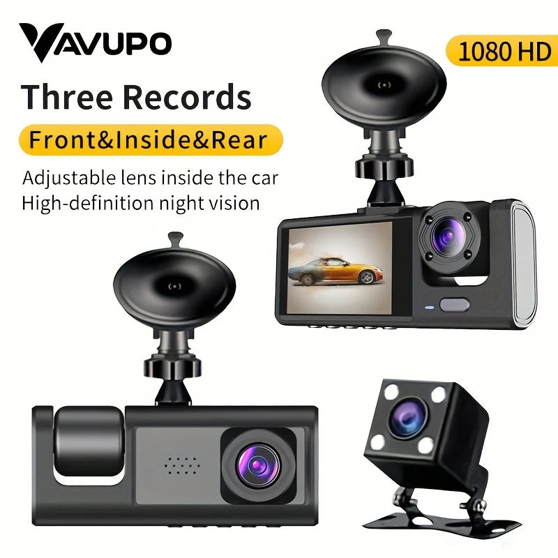 Vavupo 1080P Triple Dash Cam - Front, Inside & Rear View, IR Night Vision